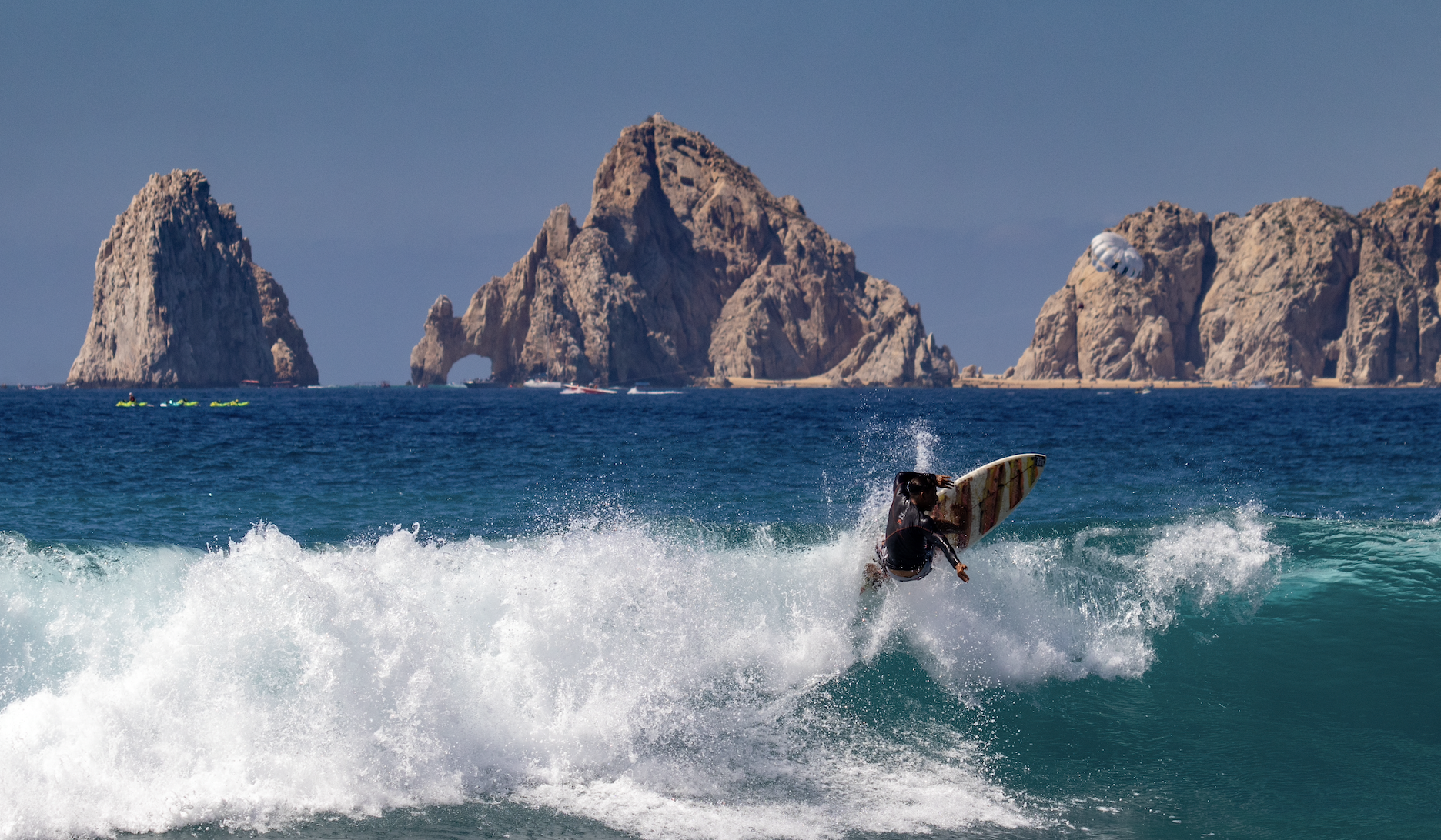 - Monuments Beach: This is the closest surf spot to Cabo San Lucas, with a tricky left-hand point break best for intermediate to advanced surfers. The view of El Arco from the water is a huge plus.